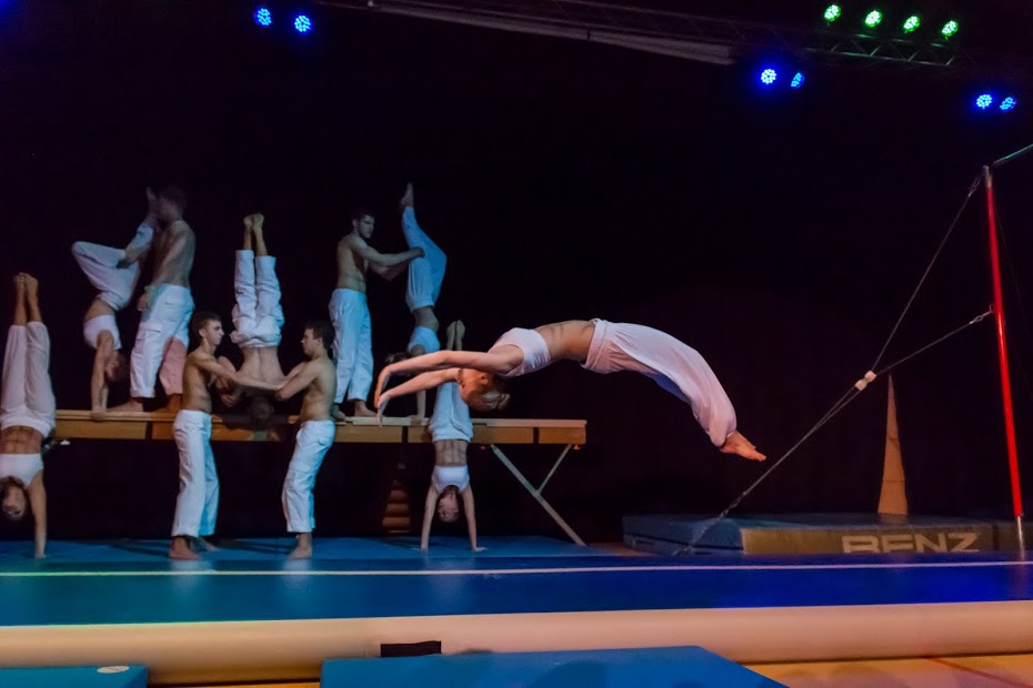 Darauf folgte der absolute Höhepunkt des Abends mit den Ligaturnerinnen und -turnern des TSV Böbingen, die sich zur Gruppe „United“ vereinten. Mit ihrer spektakulären Show am Barren, Balken, Hochreck und der neuen Airtrack brachten sie die Halle zum Brodeln. Mit ihren muskulösen Oberkörpern boten sie nicht nur etwas fürs Auge, sondern begeisterten zudem mit waghalsigen Sprüngen, Salti und Schrauben. Auf eindrucksvolle Weiße wurden zwei der Turner an Seilen bis ans Hallendach gezogen, wo sie direkt über den Köpfen der Zuschauer ihr Können an den Ringen zeigten.