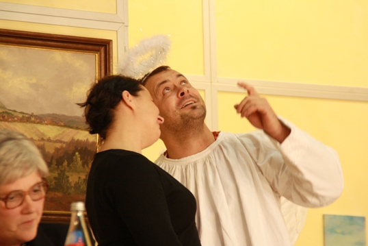 Am Ende des ersten Aktes taucht Hans Dipfele auf der Bühne auf – im fast weißen Engelskostüm und mit Ruß verschmiertem Gesicht, so als käme er geradewegs aus der Hölle. Himmlische Flügel, so erfahren die Zuschauer, müsse er sich erst noch durch die „Stiftung dreier Ehen“ verdienen. Hans kann von niemandem gesehen werden – außer von seiner Frau. Diese Tatsache führt auf der Bühne zu großer Verwirrung. Ist Erna Dipfele verrückt? Oder wieso spricht sie mit dem leeren Raum?
