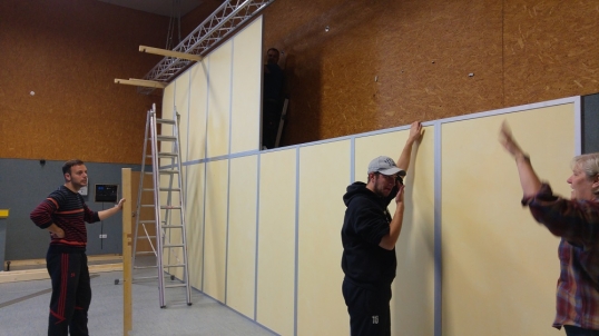 Am vergangenem Samstag, den 15.10.16, trafen sich die Theaterspieler in der TSV-Halle zum Kulissenaufbau. Alle halfen tatkräftig mit und nach einem wohlverdienten Vesper wurde das Bühnenbild vervollständigt. Natürlich fehlen noch viele Kleinigkeiten , die nach und nach dazukommen werden, um die Bühne "wohnlich" zu gestalten. Aber nun können endlich die Proben auf der Bühne beginnen, denn es sind nur noch 6 Wochen bis zur Premiere! Unsere Gaukler sind schon hochmotiviert und geben ihr Bestes, damit am 26.11.16 Text und Mimik sitzen. Wer sich das diesjährige Theaterstück "Die Million im Schuhkarton" von Albert Kräuter nicht entgehen lassen will, kann sich am 05.11.16 von 14-15 Uhr in der TSV-Halle Karten im Vorverkauf besorgen.