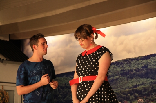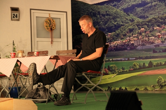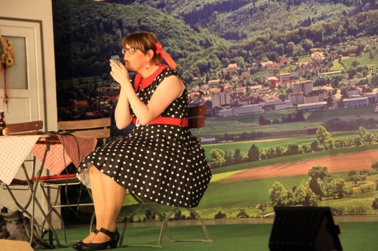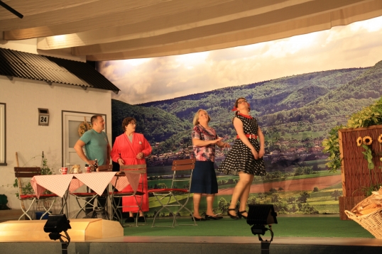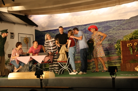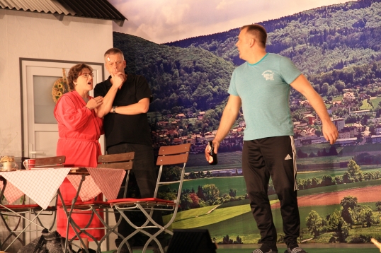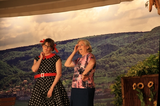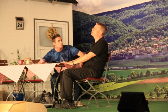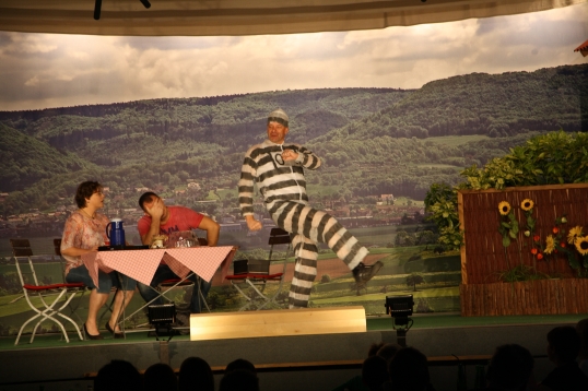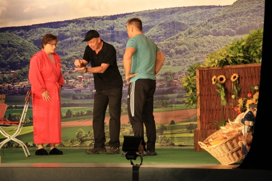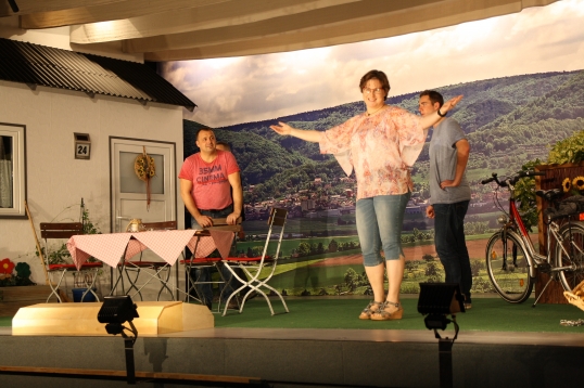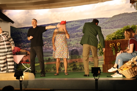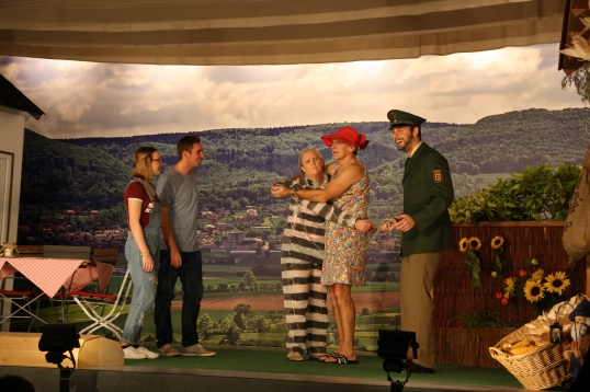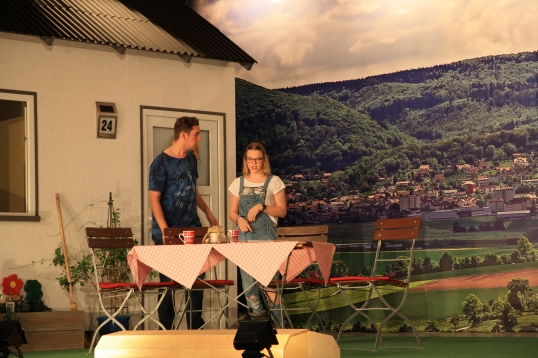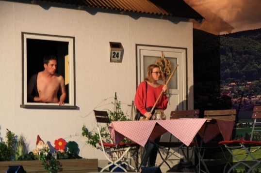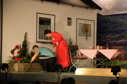 Für die heitere Kriminalkomödie hat die Theaterspielgruppe wieder eine schöne, stimmige Bühnenkulisse aufgebaut, was natürlich auch wichtig ist, damit die Story richtig realistisch rüberkommt. Man glaubt fast, man sitzt selbst vor dem Haus am schönen Sternsee-Ufer, wo die Geschichte spielt.