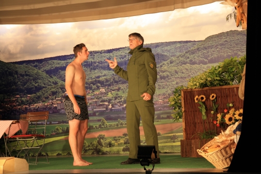 Damit nimmt die Geschichte ihren verzwickten Lauf. Vorbei ist’s mit der Beschaulichkeit am Sternsee, als just in dem Moment die beiden Polizisten Helmut (Roland Barth) und Otto (Dominik Ebert) auftauchen, da die neugierige Nachbarin Paula (Toni Schurr) und ihre naive Tochter Hermine (Petra Pfisterer) wegen eines verdächtigen Radlers in Gestalt von Onkel Willi (Bernd Grieser) die Ordnungsmacht alarmierten, die bereits nach einem Bankräuber fahndet. Mittendrin in dem Verkleidungsspiel mit deftigen Überraschungen ist noch der charmante Sohn Dietmar (Rene Kolb) der neuen fast Millionäre und dessen flotte Freundin Lisa (Vanessa Wanner).